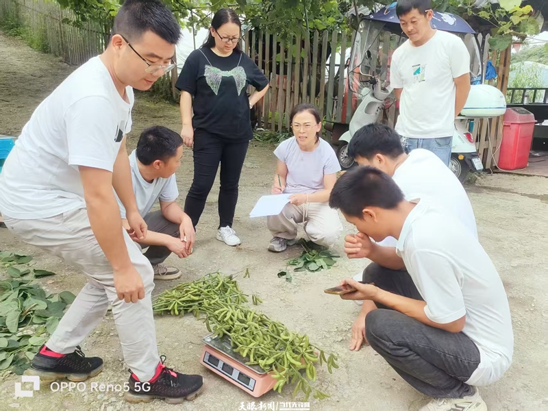 当下正值鲜食大豆采收期,省农科院副院长何光前,油料所、花溪区农业农村局相关负责人及农技人员等一行到示范基地实地考察,并进行了现场测产。实地测得,在亩密度为1.47万株的情况下,鲜豆秆豆荚产量为1384.5公斤/亩,鲜豆荚产量达到1068.1公斤/亩。豆秆豆荚按目前市场价4元/公斤计算,亩效益达到5538元,扣除成本900元,纯收益达到4638元。荚套作示范田里一片喜人的丰收景象。