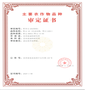 2025年11月4日,由贵州省油料研究所自主选育的第一个高油大豆新品种“黔豆18”通过贵州省主要农作物品种审定,适宜贵州省种植。